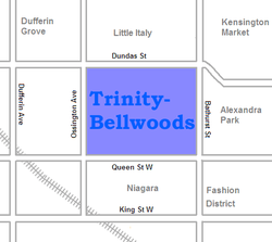 Trinity–Bellwoods is an inner city neighbourhood in Toronto, Ontario, Canada. It is bounded on the east by Bathurst Street, on the north by College Street, on the south by Queen Street West, and by Dovercourt Road on the west. It has a large Portuguese (mostly originally from the Azores and Madeira islands) and Brazilian community, and many local Lusitanian-Canadian businesses are located along Dundas Street West, continuing west into Little Portugal; this stretch further west along Dundas is known as Rua Açores.