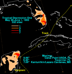 - 1 2 David M. Roth (2010-04-06). "Tropical Depression One – May 30 – June 1, 1993". Hydrometeorological Prediction Center. Retrieved 2010-04-07.