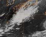 Operationally considered to have only been a tropical depression, Tropical Storm 03W developed out of a tropical disturbance along the eastern edge of a monsoon gyre on July 22. Tracking in a gradual northwest to northeast curve, the disturbance gradually intensified and was classified as a tropical depression while located 790 km (490 mi) east-northeast of Iwo Jima on July 25. The depression briefly intensified into a tropical storm, with a peak intensity of 85 km/h (50 mph 1-minute winds) as convection wrapped around the entire center of circulation. However, strong wind shear quickly blew away the associated convection, causing 03W to weaken to a tropical depression. Early on July 26, 03W degenerated into an exposed low before dissipating.[3]