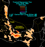 An upper level low moving across the southern Gulf of Mexico spawned an area of thunderstorm activity over the Mexican isthmus on June 16. The thunderstorm area moved northwest, pulsing in intensity, until flaring up into a larger area of deeper convection early in the morning of June 18. A surface low formed, and the system was considered well-enough organized to be a tropical depression, the second of the season, while located southeast of Brownsville, Texas.[15] On June 19, vertical wind shear from the west-southwest halted further development, and the tropical depression began a general weakening trend which continued past its landfall point in northeast Mexico. By early morning of June 20, the system completely dissipated.[12][16]