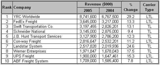 In 2005 the Logistics Management ranked the top 10 US trucking firms (by net revenue) as:[32]