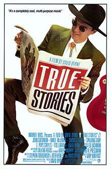 True Stories is a 1986 American film that spans the genres of musical, art, and comedy, directed by and starring David Byrne of the band Talking Heads. It co-stars John Goodman, Swoosie Kurtz, and Spalding Gray. Byrne has described the film as, "A project with songs based on true stories from tabloid newspapers. It's like 60 Minutes on acid."[1]