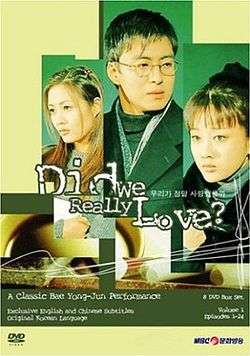 Did We Really Love? (Hangul: 우리가 정말 사랑했을까; RR: Uri-ga Jeong-mal Sarang-hae-sseul-kka) is a South Korean drama series broadcast by MBC in 1999.[1] Starring Bae Yong-joon, the series portrays the struggles between love, happiness, and the pursuit of material success.