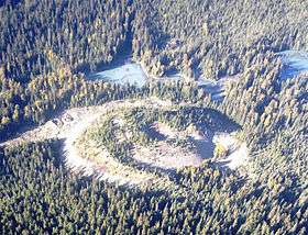 The Tseax Cone (/ˈsiːæks/ SEE-aks), also called the Tseax River Cone or the Aiyansh Volcano, is a young cinder cone and adjacent lava flows associated with the Nass Ranges and the Northern Cordilleran Volcanic Province. It is located east of Crater Creek at outlet of Melita Lake, southeast of Gitlakdamix and 60 kilometres (37 mi) north of Terrace, British Columbia, Canada.