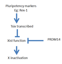 The marker Rex1, as well as other members of the pluripotency network, are recruited to the Tsix promoter and transcription elongation of Tsix occurs.[9] Along with Tsix and other proteins, factor PRDM14 has been shown to be necessary for the return to pluripotency. Assisted by Tsix, PRDM14 can associate with Xist and remove the inactivation of an X chromosome.[10]
