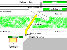 Tsugaru-Imabetsu Station (津軽今別駅 Tsugaru-Imabetsu-eki) on the Kaikyō Line opened on March 13, 1988. From 2002, only the limited express Hakuchō services stopped at this station. According to the 2015 timetable, there were two trains per day in each direction.[2]