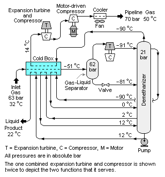 The gas stream from the gas-liquid separator enters the turboexpander where it undergoes an isentropic expansion from an absolute pressure of 62 bar to 21 bar (6.2 to 2.1 MPa) that lowers the gas stream temperature from about −51 °C to about −91 °C as it enters the demethanizer to serve as distillation reflux.