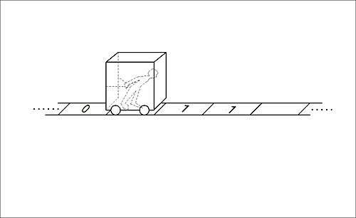 - "We are not concerned with the mechanics or the electronics of the matter. Perhaps the simplest way to picture the thing is quite crudely: Inside the box there is a man, who does all the reading and writing and erasing and moving. (The box has no bottom: the poor mug just walks along between the ties, pulling the box with him.) The man has a list of m instructions written down on a piece of paper. He is in state qi when he is carrying out instruction number i [etc.]" (Boolos and Jeffrey (1974, 1999) p.21)