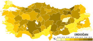 The election was criticised by both the political opposition and international observers for alleged media bias in favour of Recep Tayyip Erdoğan, corruption allegations, the inaccuracy of opinion polls and the misuse of official public resources during Erdoğan's campaign.[8][9][10][11] While praising the authorities for safeguarding the right to assembly as well as the peaceful electoral conduct, the Organization for Security and Co-operation in Europe (OSCE) voiced concerns over the unequal distribution of campaign resources and media intimidation.[12][13] The historic 12-year low turnout of 74.13%, attributed to the fact that the election was held in summer while many citizens were on holiday, was seen by many politicians such as MHP leader Devlet Bahçeli as a significant factor in affecting the outcome.[14][15][16] The election loss for the opposition CHP resulted in its leader Kemal Kılıçdaroğlu taking the decision to hold a party convention with a leadership election in response to growing dissatisfaction against his electoral performance.[17][18]