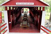 The Twin Bridges-West Paden Covered Bridge No. 121 is a historic wooden covered bridge located at Fishing Creek Township in Columbia County, Pennsylvania. It is a 112-foot-long (34 m), Burr Truss bridge constructed in 1850. It crosses the Huntington Creek. It is one of 28 historic covered bridges in Columbia and Montour Counties. It is a twin of the Twin Bridges-East Paden Covered Bridge No. 120.[2]