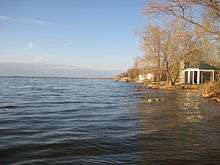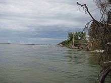 After closing on August 5, just under 4,700,000 acre feet (5.8 km3) (4.1 feet (1.2 m) rise) of water was directed toward Lake Manitoba rather than Winnipeg and the Red River, this number being more than three times the volume of the 1976 flood.[13] After considering the fact that without the existence of the Portage Diversion, some water would flow into Lake Manitoba near Delta Beach through oxbow lakes and channels which were at one time the original channels of the Assiniboine River when it flowed to Lake Manitoba naturally around 2000 years ago, it is estimated that the Portage Diversion contributed to at least 3 feet (0.91 m) of a rise in water levels on Lake Manitoba, accounting for most of the rise of the lake.[14] The volume of water diverted through the Portage Diversion in 2011 dwarfs the annual normal contributions of the two major tributaries of Lake Manitoba as the Waterhen and Whitemud Rivers contribute 1,900,000 acre feet (2.3 km3) and 149,000 acre feet (184,000,000 m3) respectively on average to the lake, although the contributions of these two rivers are higher in 2011 as there has been above average precipitation in the watersheds of Lake Manitoba's major tributaries.[5] Even when average precipitation of about 1,800,000 acre feet (2.2 km3) and average local flows of about 108,000 acre feet (133,000,000 m3) are added to inflows, the expected total normal inflows would still be less than the roughly 4,700,000 acre feet (5.8 km3) that the Portage Diversion contributed by the end of the flood season in 2011 when it ceased operation on August 5.[5][13][14][15]