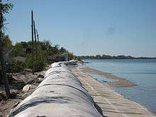 Beginning in early September with construction running into October, TITANTubes (sometimes referred to as geotubes or geotextile tubes)manufactured by Flint Industries(USA) were installed along most of the shoreline of the section of the beach in the Rural Municipality of Woodlands. Woodlands was given a $2 million grant from the Province of Manitoba to complete the wave breaker trial project. The geotextile tubes were built to a level of 824 feet (251 m) above sea level to provide protection against waves and storm surges often seen on the lake.[37] Geotextile tubes were also installed on parts of Delta Beach as well as nearby Sandpiper Beach. The goal was to have completed 17 kilometres (11 mi) of Geotextile tubes, but only 3.8 kilometres (2.4 mi) were installed around the lake.[38] This includes the 6,614 feet (2,016 m) installed along Twin Lakes Beach.[39]