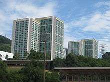 Twin Tower (雙塔型) is a 1970s' design of residential block of Hong Kong public housing estate. The plan looks like two hollow squares joining one corner of each square. Two towers are of different heights although their shapes are the same. The flat sizes in these 20 to 23-storey towers ranged from 36 to 46 m2.[1]
