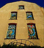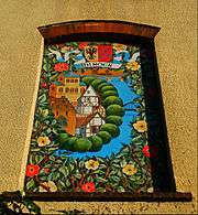 Public art has been used to celebrate twin town links, for instance in the form of seven mural paintings in the centre of the town of Sutton, Greater London. The five main paintings show a number of the main features of the London Borough of Sutton and its four twin towns, along with the heraldic shield of each above the other images. Each painting also features a plant as a visual representation of its town's environmental awareness.[30] In the case of Sutton this is in a separate smaller painting (above its main one) showing a beech tree, intended as a symbol of prosperity and from which Carshalton Beeches in the borough derives its name.[31]