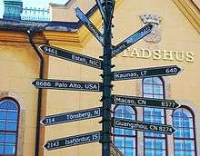 A recent study has concluded that geographical distance has very little, if any, influence upon communities' selections of a twin town or sister city.[32] Twinned towns are often chosen because of similarities between them; thus about 15 towns in Wales are twinned with towns in Brittany, and Oxford is with Bonn, Leiden, Grenoble and other university cities.[1] Many former West German cities are twinned with former East German cities; these twinning links were established before the fall of the Iron Curtain. Famous examples are the partnerships of Hanover and Leipzig, both of which have important trade fair grounds, or between Hamburg and Dresden. The first US-German town twinning was in 1947 between Worthington, Minnesota and Crailsheim.[1] St Petersburg in Russia holds the record for the largest number of partnership arrangements with other communities.[32] In June 2012, the Scottish village of Dull and the US town of Boring, Oregon, agreed to twin their municipalities to promote tourism in both places, playing on their names.[33][34][35]