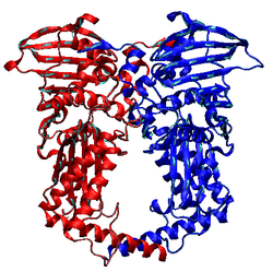 A recent structure of the topo VI A/B complex was solved, showing an open and closed conformation, two states that are predicted in the two-gate mechanism (see below). These structures, of which one is an X-ray crystal structure and the other is a Small-Angle X-ray Scattering (SAXS) reconstruction, show that the ATPase domain can be either open or closed (Corbett, Benedetti, Berger Nature Structure Molecular Biology, 2007, PDB ID = 2Q2E).