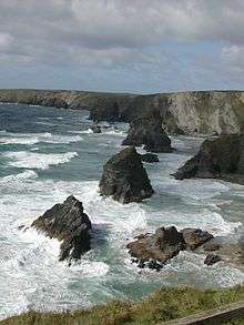 Bedruthan Steps, North Cornwall, a spectacular section of the UK coastline, managed by the National Trust