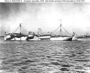 At noon on 11 April 1919, Agwidale was decommissioned and turned over to representatives of the United States Shipping Board, a civilian crew replacing a token Navy one the following afternoon. Agwidale retained her name for the rest of her days under American registry, which extended through the depression years and World War II. Initially operated by the Clyde Steamship Co., she later worked under the flag of the Clyde Mallory Line, and, still later, Agwilines Incorporated, until she was sold to Chinese interests in 1946 and renamed Wei Ming. Her subsequent fate is a mystery.