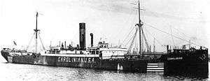 ![]() SS Carolinian in 1917, with deck gun platforms fitted but still bearing neutrality markings | |