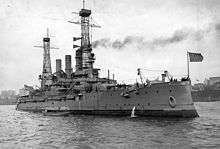 New Hampshire was laid down on 1 May 1905 at the New York Shipbuilding Corporation in Camden, New Jersey. She was launched on 30 June 1906 and was christened by Hazel McLane, the daughter of John McLane, then the Governor of New Hampshire. The ship was commissioned into the US Navy on 19 March 1908; her first commander was Captain Cameron Winslow. After completing final fitting-out work, New Hampshire transported a Marine Expeditionary Regiment to Colón, Panama on 20 June, arriving six days later. She then made a series of visits to ports on the eastern coast of North America, including Portsmouth, New York, and Bridgeport, along with a stop in the Canadian province of Quebec. The ship was then overhauled in New York, followed by training exercises in the Caribbean Sea. On 22 February 1909, she participated in a Naval Review for President Theodore Roosevelt to greet the return of the Great White Fleet in Hampton Roads, Virginia.[2] During this period, Ernest King, later the Chief of Naval Operations during World War II, served aboard the ship in the engine room.[3]