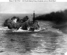 USS North Dakota (BB-29) was a dreadnought battleship of the United States Navy, the second member of the Delaware class, her only sister ship being Delaware. North Dakota was laid down at the Fore River Shipyard in December 1907, was launched in November 1908, and commissioned into the US Navy in April 1910. She was armed with a main battery of ten 12-inch (305 mm) guns and was capable of a top speed of 21 kn (24 mph; 39 km/h). North Dakota was the first vessel of the US Navy to be named after the 39th state.