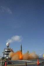 She was decommissioned in 1995 and as of 2004, she was on loan to the Army, but remained laid up at Mare Island Naval Shipyard. In December 2006, the ship was towed to Pearl Harbor, Hawaii, where it had a high-tech role as a launch platform with the nation's developing ballistic missile defense program. Three times the ship was towed some 100 miles off shore and used to launch small ballistic missiles, which are then intercepted by Terminal High Altitude Area Defense Missiles, test-fired from the Pacific Missile Range Facility. The last test in the series was performed 26 October, when the ship fired a "Scud-like" missile, which was successfully intercepted. The ship was towed back to the San Francisco Bay Area for the winter. Kaua'i lacks a suitable land-based launch site, and the costs of building one would far exceed the approximately $600,000 per year it costs to use the old warship, so the vessel returned to Pearl Harbor for a second series of tests in late spring 2008.[3] As of 6 September 2014 she is berthed at Pier 80 in San Francisco, California. In August 2016 the US Maritime Administration designated her for disposal.[4]