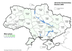 Comparing the results with early polls (but not with 2005 opinion polls[3]), it was unexpected that President Viktor Yushchenko's party "Our Ukraine" received less than 14% of the national vote, coming third after the Party of Regions, and the Yulia Tymoshenko Bloc.