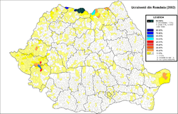 The Ukrainians (Ukrainian: Українці, Romanian: Ucraineni) are the third-largest ethnic minority in Romania. According to the 2011 Romanian census they number 51,703 people, making up 0.3% of the total population.[1] Ukrainians claim that the number is actually 250,000-300,000.[2] Ukrainians mainly live in northern Romania, in areas close to the Ukrainian border. Over 60% of all Romanian Ukrainians live in Maramureş County (31,234), where they make up 6.77% of the population. Sizable populations of Ukrainians are also found in Suceava County (5698 people), Timiş County (5953), Caraş-Severin County (2600), Satu Mare County (1397), Tulcea County (1317) and Arad County (1295). Ukrainians make up a majority in seven communes of Maramureş County (Bistra, Bocicoiu Mare, Poienile de sub Munte, Remeți, Repedea, Rona de Sus and Ruscova) and three in Suceava County (Bălcăuţi, Izvoarele Sucevei and Ulma), as well as in Ştiuca, Timiş and Copăcele, Caraş-Severin. According to the 2002 census, 79% of Ukrainians were Eastern Orthodox, organized into the Ukrainian Orthodox Vicariate Sighetu Marmației; 10% Pentecostal; 2.8% Greek-Catholic, organized into the Ukrainian Greek-Catholic Vicariate Rădăuţi; 2.1% Seventh-day Adventist; 1.2% Lipovan Orthodox and 2.9% stated they belonged to "another religion".[3]