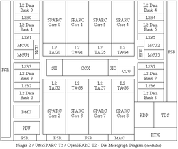 Sun Microsystems' UltraSPARC T2 microprocessor is a multithreading, multi-core CPU. It is a member of the SPARC family, and the successor to the UltraSPARC T1. The chip is sometimes referred to by its codename, Niagara 2. Sun started selling servers with the T2 processor in October 2007.