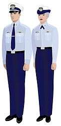 The uniforms of the United States Coast Guard Auxiliary serve to distinguish Auxiliarists from members of other civilian auxiliaries and of other armed services. Auxiliarists are expected to wear a uniform intended for the situation and mission.[1] Each auxiliary uniform is identical to a Coast Guard officer's military uniform, with the exception that the buttons and stripes on dress jackets and shoulder boards are silver in color, rather than gold. On dress uniforms, appointed staff officers wear insignia with a red "A" and elected officers wear insignia with a blue "A", while black "A"s are worn on insignia by both elected and appointed officers on the ODU uniform. Auxiliarists are expected to adhere to the same rules of correct uniform wear as regular Coast Guard officers. When augmenting Coast Guard personnel, the military-style insignia of Auxiliary position is generally removed and the organizational insignia is worn.