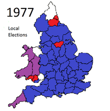 Local elections were held in the United Kingdom in 1977. The results were a major mid-term setback for the Labour government, and the Conservatives, the main opposition, comprehensively regained control of the Greater London Council with 64 seats against Labour's 28. Elections were also held in the county councils and in Northern Ireland.[1][2]