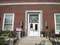 US Post Office-Garden City is a historic post office building located at Garden City in the town of Hempstead, Nassau County, New York, United States. It was built in 1936 and designed by consulting architects Walker & Gillette for the Office of the Supervising Architect. It is a one story, square brick building on a granite in the Classical Revival style. The lobby features a 1937 mural by J. Theodore Johnson titled "Huckleberry Frolic."[2] On December 24, 1987, the building was named in honor of former Congressman John W. Wydler (1924-1987).