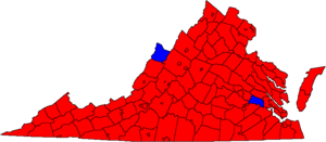 | U.S. Senate election results map. Red denotes counties/districts won by Warner. Blue denotes those won by Harrison. |