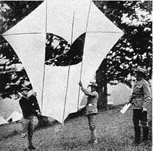 The first kite used by the United States Army Signal Corps specifically for raising an antenna was designed and built by Sergeant Thomas I. King, Signal Corps Company A, while stationed at Fort Leavenworth, Kansas, in 1905. The “King” kite was large, 7 feet high and 5 feet wide, made of 50 yards of white Japanese silk on a bamboo frame, and weighed less than 2 pounds.[2] Similar to Silas J. Conyne's kite of 1902,[3] it had a diamond shape with a squared-off top and bottom, keel, and large opening in the center to gave it some of the stability of a box kite. It was used either singly or in trains of 2 to 4 kites or, on less windy days, in conjunction with a balloon to provide extra lift.