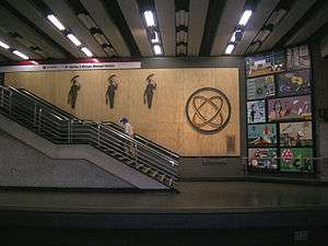 The station has a central mezzanine that overlooks the outer portions of the platform level. There is artwork on the walls of the four platforms stairways that honors the aforementioned university, which was unveiled on August 30, 2005.[2]