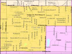University is bounded by Interstate 275 to the west, Tampa city limits to the south, University of South Florida to the east, and Bearss Avenue to the north. Its historical boundaries stretch as far east as Morris Bridge Road; however, the boundaries were scaled back owing to annexations by Tampa and Temple Terrace during the 1980s.