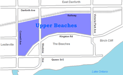 The Upper Beaches is a rather recently coined name for the neighbourhood directly north of the Beaches area in Toronto, Ontario, Canada. It stretches from Coxwell Avenue in the west to Victoria Park in the east. The southern border is Kingston Road, while the northern boundary is generally considered to be the Canadian National Railway tracks between Gerrard Street and Danforth Avenue. The western part of the area was originally called Norway, and the larger area was once part of the Town of East Toronto. The name "Upper Beaches" was first used by developers and real estate agents around the period of 2001 to 2003 for the selling of houses on redeveloped land in the area, and was used as a marketing tag to attract buyers. The area was never considered part of the Beaches neighborhood, but was close to it. The city's current name for this area is East End Danforth, though that is rarely used. The city also includes the buildings along and just north of Danforth Avenue in the neighbourhood. The western portion between Woodbine Avenue and Coxwell is referred to by the city as Woodbine Corridor.