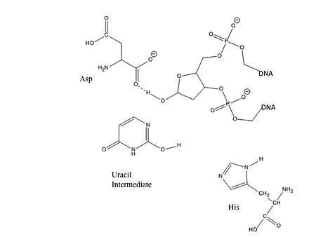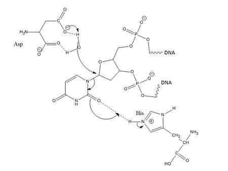 The position of the residues that activate the water nucleophile and protonate the uracil leaving group are widely debated, though the most commonly followed mechanism employs the water activating loop detailed in the enzyme structure.[11][13] Regardless of position, the identities of the aspartic acid and histidine residues are consistent across catalytic studies.[9][10][11][13][14]