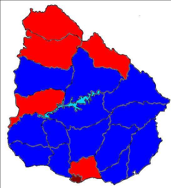 In the following map of Uruguay, departments coloured in blue represent the departments where the Partido Nacional won, the departments coloured in red represent the departments where the Partico Colorado won, and the departments coloured in dark red represent the departments where the Frente Amplio won.
