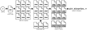 A visual example of the many complex steps required to prepare data to be uploaded to Usenet newsgroups. These steps must be done again in reverse to download data from Usenet.