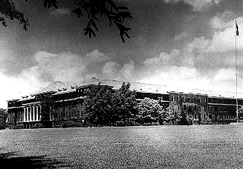Mississippi State's campus is centered on the main quadrangle, called the Drill Field (pictured) due to its heavy use by the Corps of Cadets prior to the end of World War II. The Drill Field is defined at its north and south ends by the mirror-image buildings, Lee Hall (the original University building, now the division of languages building, far left in picture below) and Swalm Hall (home to the Dave C. Swalm School of Chemical Engineering, far right in picture below). Old Main was the original dormitory, west of Lee Hall; it burned in a tragic fire, and was replaced by the Colvard Student Union. The largest building fronting the Drill Field is Mitchell Memorial Library.