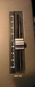 A variable speed pitch control (or vari-speed) is a control on an audio device such as a turntable, tape recorder, or CD player that allows the operator to deviate from a standard speed (such as 33⅓, 45 or even 78 rpm on a turntable). The latter term "vari-speed" is more commonly used for tape decks, particularly in the UK. Analog pitch controls vary the voltage being used by the playback device; digital controls use digital signal processing to change the playback speed or pitch. A typical DJ deck allows the pitch to be increased or reduced by up to 8%, which is achieved by increasing or reducing the speed at which the platter rotates.