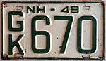 | 1949 | Embossed forest green numbers on white plate with border line; "NH - 49" embossed in forest green block letters centered at top | none | A/B123 | County-coded | ||