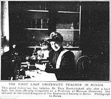 In 1908 Danchakoff became an assistant professor at Moscow University – the first woman to become a professor in Russia.[6][7] In 1915 she emigrated to the United States where she first worked at the Rockefeller Institute for Medical Research in New York City. Then at the Columbia University College of Physicians and Surgeons, led by Thomas Hunt Morgan, she was "instructor in anatomy" at a time when women were first being allowed admittance as students.[1][8] In a 1916 lecture she said
