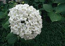Viburnum × carlcephalum (V. carlesii × V. macrocephalum), common name fragrant snowball, is a hybrid flowering plant in the family Adoxaceae (formerly Caprifoliaceae), of garden origin. Growing to 3 m (10 ft) tall and broad, it is a substantial deciduous shrub with heart-shaped leaves often turning red in autumn. Rounded flower-heads composed of many fragrant, tubular white flowers are borne in early summer.[1] Flowering is later than many other deciduous viburnums.[2] The flowers are followed in autumn by insignificant red-black fruits.