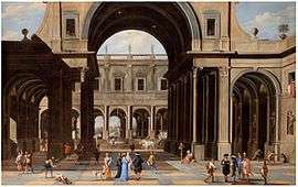 His compositions often include figures which represent a religious scene but without attempting to depict a particular biblical episode. As is the case with Viviano Codazzi, several of compositions also include daily scenes in which elegantly dressed personages appear together with simply dressed common people. This shows his debt to the genre works of the group of genre painters active in Rome and known as the Bamboccianti who depicted Roman scenes with ordinary people. The careful physiognomies and gestures of his figures also show his familiarity with the figures of Cornelis de Wael and Pandolfo Reschi. His compositions regularly used compositional and architectonical schemes borrowed from Viviano Codazzi. [4]