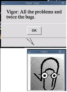 Vigor is a clone of vi for UNIX that adds a parody of Clippit, the Microsoft Office assistant. The name is a portmanteau of vi (the name of the Unix text editor) and Igor, Dr. Frankenstein's assistant. Vigor was written by Joel Ray "Piquan" Holveck in Sunnyvale, California, and the logo for Vigor was created by Tom Mulder. Vigor has spawned ports to other text editors as well, including Vim. There is also a Vigor visualization plugin for the audio player XMMS.