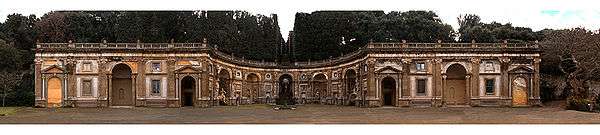 Aldobrandini commissioned the Roman architect Giacomo della Porta to convert the villa into suitable accommodation in which a Cardinal could live and also entertain a Pope. Worked started in 1598.[2] While the core of the villa was completed by the time of Giacomo della Porta's death in 1603, work continued for another 20 years on the various aspects of the villa and the garden under the supervision of Carlo Maderno who added the loggia[3] and Giovanni Fontana.
