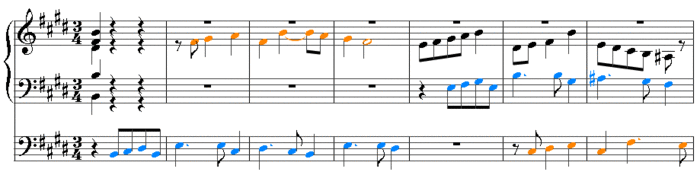 Buxtehude's impact is apparent in some of Lübeck's fugue subjects,[6] as well as the five-section structure of the E major work. The free sections often feature virtuosic pedal solos, and the G minor work includes double-pedal passages (see Example 1) of a type which is to be found several times in Reincken's output but which is absent from Buxtehude's. Most of Lübeck's fugues have an obbligato countersubject, commonly introduced during the first statement of the subject: