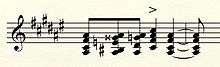 For example, Messiaen has written that "The 'Theme of Chords' is heard throughout, fragmented, concentrated, surrounded with resonances, combined with itself, modified in both rhythm and register, transformed, transmuted in all sorts of ways: it is a complex of sounds intended for perpetual variation, pre-existing in the abstract like a series, but quite concrete and quite easily recognizable through its colours: a steely grey-blue shot through with red and bright orange, a mauve violet spotted with leather-brown and encircled by bluish-purple."[1]
